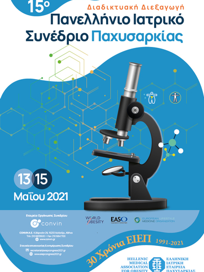 Η Ελληνική Ιατρική Εταιρεία Παχυσαρκίας (Ε.Ι.Ε.Π.) διοργανώνει το 15ο Πανελλήνιο Συνέδριο Παχυσαρκίας, το τριήμερο 13-15 Μαΐου 2021, για πρώτη φορά διαδικτυακά. Το συνέδριο, που αποτελεί εδώ χρόνια θεσμό της επιστημονικής και εκπαιδευτικής δραστηριότητας της Εταιρείας, συμπίπτει φέτος με τη συμπλήρωση των 30 χρόνων από την ίδρυση της.