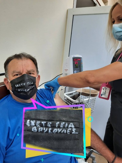 Ο γνωστός Πατρινός Σπύρος Βέρροιος, δημοτικός υπάλληλος και επί σειρά ετών dj την δεκαετία του ’80 σε πολλά κλαμπ της εποχής, έκανε το εμβόλιο, αλλά με αρκετή δόση χιούμορ. Φόρεσε μία μάσκα που έγραφε πάνω “έχετε γεια βρυσούλες” και φυσικά ήταν αδύνατον να περάσει απαρατήρητος.