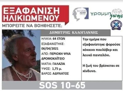 Έχει γαλανά μάτια και ύψος 1,75μ. Την ημέρα που εξαφανίστηκε, φορούσε κόκκινο πουλόβερ και λευκό παντελόνι. Η ΓΡΑΜΜΗ ΖΩΗΣ, ειδοποιήθηκε από τους οικείους του το απόγευμα της 26/05/2021 και μετά τη συγκέντρωση των απαιτούμενων δικαιολογητικών, ενεργοποιεί τον Κοινωνικό Συναγερμό SILVER ALERT, για την κινητοποίηση όλων για την ανεύρεσή του. Εάν γνωρίζετε κάτι επικοινωνήστε με την υπηρεσία Silver Alert, όλο το 24ωρο, στην Εθνική Γραμμή SOS 1065.