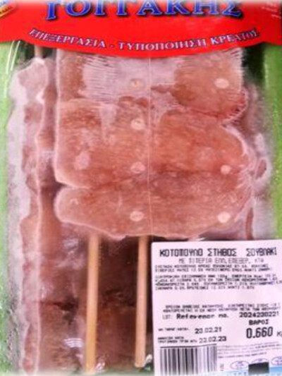 «Ο Ε.Φ.Ε.Τ και συγκεκριμένα η Περιφερειακή Διεύθυνση Ηπείρου, κατά τη διενέργεια ελέγχων στο πλαίσιο του Προγράμματος «Επίσημος έλεγχος Μικροβιολογικών κριτηρίων ασφάλειας τροφίμων» έτους 2021, προέβη σε δειγματοληψία κατεψυγμένου παρασκευάσματος κρέατος από κρέας πουλερικών, με την εμπορική ονομασία «ΚΟΤΟΠΟΥΛΟ ΣΤΗΘΟΣ ΣΟΥΒΛΑΚΙ ΜΕ ΠΙΠΕΡΙΑ ΚΤΨ» με αριθμό παρτίδας 2024230221, ημερομηνία παραγωγής/κατάψυξης 23/02/21 και ημερομηνία ανάλωσης 23/02/23, που παράγεται και διακινείται από την επιχείρηση ΓΟΓΓΑΚΗΣ ΑΕΒΕ και σε συνεργασία με το Κτηνιατρικό Εργαστήριο Ιωαννίνων, διαπιστώθηκε η παρουσία Salmonella spp. στο ανωτέρω δείγμα.