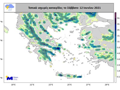 Στον προγνωστικό χάρτη του meteo που ακολουθεί παρουσιάζονται με μπλε-πράσινες αποχρώσεις οι περιοχές όπου θα εκδηλωθούν βροχοπτώσεις τις μεσημεριανές και απογευματινές ώρες του Σαββάτου και με κίτρινα σύμβολα οι περιοχές όπου αναμένονται καταιγίδες.