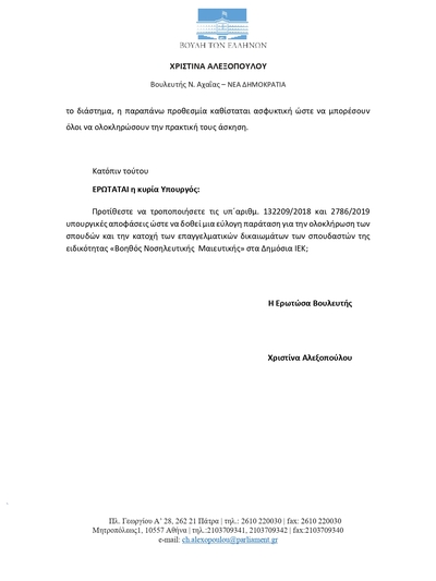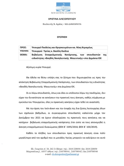 Ερώτηση προς την αρμόδια Υπουργό Παιδείας και Θρησκευμάτων Νίκη Κεραμέως, κατέθεσε η Βουλευτής Αχαΐας της Νέας Δημοκρατίας Χριστίνα Αλεξοπούλου, σχετικά με την απόκτηση Βεβαίωσης Επαγγελματικής Κατάρτισης, των σπουδαστών της ειδικότητας «Βοηθός Νοσηλευτικής Μαιευτικής» στα Δημόσια ΙΕΚ.