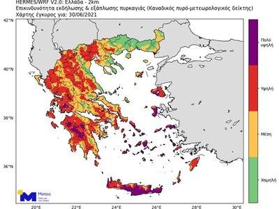 Με βάση τον Καναδικό πυρομετεωρολογικό δείκτη, ο οποίος υπολογίζεται επιχειρησιακά από το Eθνικό Aστεροσκοπείο Aθηνών/meteo.gr, για την Τετάρτη 30 Ιουνίου 2021, πολύ υψηλή επικινδυνότητα για εκδήλωση και εξάπλωση δασικών πυρκαγιών αναμένουμε σε Κυκλάδες, Κρήτη και Αν. Αιγαίο, καθώς και κατά τόπους στην Πελοπόννησο.