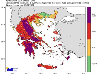 Ως εκ τούτου, πολύ υψηλός θα είναι ο κίνδυνος για εκδήλωση και εξάπλωση δασικών πυρκαγιών την Πέμπτη 1 Ιουλίου 2021 σε Πελοπόννησο (κυρίως σε Αργολίδα, Κορινθία, Λακωνία), Βοιωτία, Φθιώτιδα, και Δωδεκάνησα (κυρίως στα ανατολικά τμήματα των νήσων), αλλά και κατά μήκος του ηπειρωτικού κορμού της χώρας ανατολικά της Πίνδου.