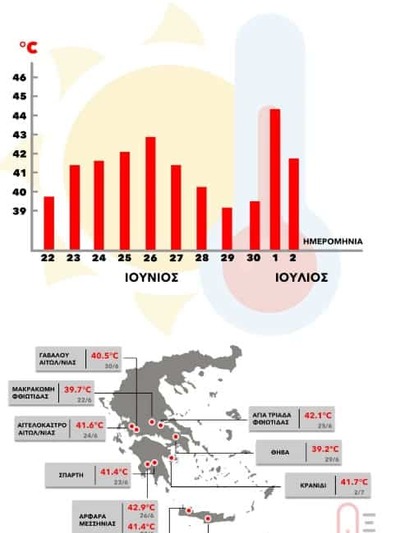 Επιπλέον, ρεκόρ υψηλών θερμοκρασιών από την έναρξη λειτουργίας τους σημειώθηκαν σε εννέα μετεωρολογικούς σταθμούς του ΕΑΑ-meteo: Βατερή-Λίμνη Ευβοίας 43,0°C, Αυλίδα 43,0°C, Χαλκίδα 42,9°C, Πλατανιάς 42,9°C, Αλικιανός 42,5°C, Χανιά 42,6°C, ‘Αγ. Πάντες Χανίων 42,2°C, Φράγμα Ποταμών Ρεθύμνου 41,8°C, και Βαγιωνιά Ηρακλείου