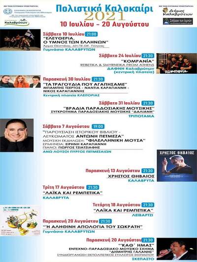 Η ΔΗ.Κ.Ε.Κ. Σπήλαιο Λιμνών Καστριών σε συνεργασία με τον Δήμο Καλαβρύτων, δίνουν το παρόν για δεύτερη χρονιά σε πείσμα των καιρών, με μια σειρά πολιτιστικών εκδηλώσεων. Με γνώμονα την εξωστρέφεια, τις συνεργασίες και την πολιτιστική αναβάθμιση και αποκέντρωση, παρουσιάζουν εκδηλώσεις υψηλής καλλιτεχνικής και κοινωνικής αξίας.