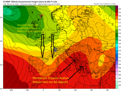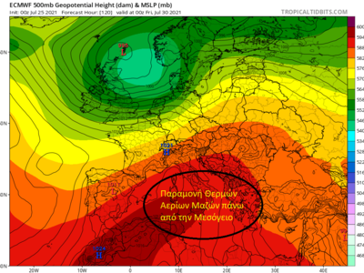 Ειδικότερα, χαμηλές πιέσεις θα επικρατήσουν στην ΒΔ Ευρώπη (Μεγάλη Βρετανία) σε συνδυασμό με ψυχρότερες αέριες μάζες. Αυτό θα έχει ως αποτέλεσμα να ''εξαναγκαστούν'' υψηλότερες βαρομετρικές πιέσεις από την ΒΔ Αφρική σε επέκταση προς τα ΒΑ συνοδευόμενες από πολύ θερμές αέριες μάζες που θα ''σκαφθούν'' από την γειτονική ήπειρο. Η κατάσταση αυτή στην ατμοσφαιρική κυκλοφορία φαίνεται να διατηρείται για πολλές ημέρες με απόρροια την συνεχή ανατροφοδότηση της τροπόσφαιράς μας με τις πολύ θερμές αυτές μάζες.
