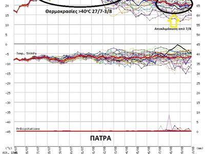 Χαρακτηριστικό είναι και το παρακάτω διάγραμμα ensemble για την πόλη της Πάτρας, σύμφωνα με το οποίο ο υδράργυρος θα φλερτάρει και θα ξεπερνά τους 40°C για αρκετές ημέρες.