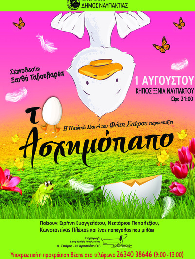 Στο πλαίσιο των Πολιτιστικών Εκδηλώσεων του γειτονικού Δήμου Ναυπακτίας για το καλοκαίρι του 2021, η παιδική σκηνή του ηθοποιού Φώτη Σπύρου και η Long Vehicle Productions συνεργάζονται με το θέατρο Ρέον και παρουσιάζουν το μαγικό παραμύθι του Δανού παραμυθά Χανς Κρίστιαν Άντερσεν «Το Ασχημόπαπο», την Κυριακή 1η Αυγούστου 2021 στον κήπο «Ξενία» Ναυπάκτου, στις 21:00 το βράδυ.