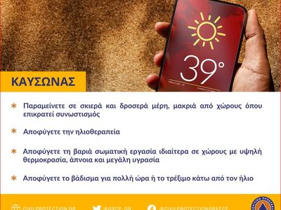 Η Γενική Γραμματεία Πολιτικής Προστασίας συνιστά στους πολίτες να είναι ιδιαίτερα προσεκτικοί, μεριμνώντας για τη λήψη μέτρων αυτοπροστασίας από κινδύνους που προέρχονται από την επικράτηση των υψηλών θερμοκρασιών.