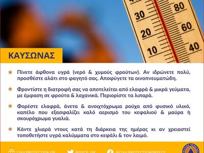 Για περισσότερες πληροφορίες και οδηγίες αυτοπροστασίας από τις υψηλές θερμοκρασίες, οι πολίτες μπορούν να επισκεφθούν την ιστοσελίδα της Γενικής Γραμματείας Πολιτικής Προστασίας στην ηλεκτρονική διεύθυνση www.civilprotection.gr και την ιστοσελίδα του Υπουργείου Υγείας: