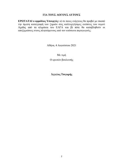 Πιο συγκεκριμένα, ο Αχαιός βουλευτής κ. Τσιγκρής ρωτάει τον Υπουργό Αγροτικής Ανάπτυξης: α) σε ποιες ενέργειες θα προβεί με σκοπό την άμεση καταγραφή των ζημιών στις καλλιεργήσιμες εκτάσεις του νομού Αχαΐας από τα κλιμάκια του ΕΛΓΑ και β) πότε θα καταβληθούν οι αποζημιώσεις στους πληττόμενους από τον καύσωνα παραγωγούς.
