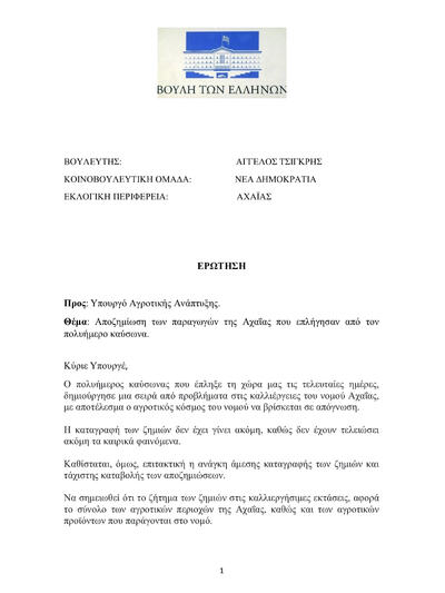 Στο πλαίσιο του κοινοβουλευτικού ελέγχου, ο βουλευτής Αχαΐας της Νέας Δημοκρατίας Άγγελος Τσιγκρής κατέθεσε Ερώτηση προς τον Υπουργό Αγροτικής Ανάπτυξης Σπήλιο Λιβανό, με την οποία ζητά την καταβολή αποζημίωσης στους παραγωγούς της Αχαΐας που επλήγησαν από τον πολυήμερο καύσωνα.