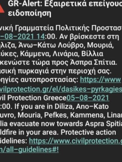 Το μήνυμα αναφέρει: Αν βρίσκεστε στη Βύλιζα, Άνω-Κάτω Λόυβρο, Μουριά, Πεύκες, Καμμένα, Λινάρια, Βίλλια Ηλείας εκκενώστε τώρα προς 'Ασπρα Σπίτια.