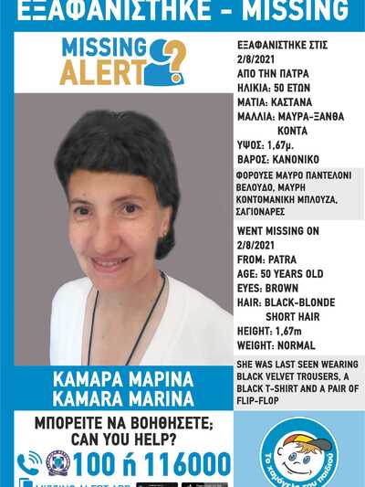 Η οικογένεια της ανησύχησε μετά από τις πρώτες ώρες που δεν είχε επικοινωνήσει μαζί τους και άμεσα ειδοποίησαν την αστυνομία η οποία εξέδωσε Missing Alert. Σύμφωνα με αυτό η 50χρονη Μαρίνα Καμαρά ή Καμάρα εξαφανίστηκε στις 2 Αυγούστου ενώ φορούσε Μαύρο παντελόνι βελούδο, μαύρη κοντομάνικη μπλούζα και σαγιονάρες.