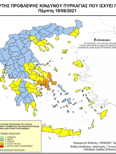 Ο συνδυασμός των ισχυρών ανέμων και των υψηλών θερμοκρασιών που θα επικρατήσει και το επόμενο 24ωρο (19.08.2021), διατηρεί σε υψηλότατα επίπεδα τον κίνδυνο των πυρκαγιών. Σύμφωνα με τον Χάρτη που εκδίδει η Γενική Γραμματεία Πολιτικής Προστασίας του Υπουργείου Προστασίας του Πολίτη (www.civilprotection.gr), για την Πέμπτη 19 Αυγούστου 2021, προβλέπεται πολύ υψηλός κίνδυνος πυρκαγιάς (κατηγορία κινδύνου 4) για τις εξής περιοχές: