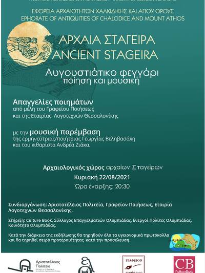Στο πλαίσιο των εκδηλώσεων του Υπουργείου Πολιτισμού και Αθλητισμού για την αυγουστιάτικη πανσέληνο στις 22 Αυγούστου 2021 σε αρχαιολογικούς χώρους, το Γραφείον Ποιήσεως και η Εταιρία Λογοτεχνών Θεσσαλονίκης σε συνδιοργάνωση και με την φιλοξενία της "Αριστοτελείου Πολιτείας" την στήριξη του Culture Book και τον Σύλλογο Επαγγελματιών Ολυμπιάδας και των Ενεργών Πολιτών Ολυμπιάδας, διοργανώνουν την εκδήλωση με θέμα «Αυγουστιάτικο φεγγάρι», εντός του Αρχαιολογικού χώρου των αρχαίων Σταγείρων στην Ολυμπιάδα Χαλκιδικής.