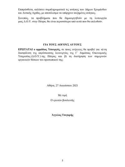 Πιο συγκεκριμένα, ο Αχαιός βουλευτής ρωτάει τον Υπουργό Οικονομικών, σε ποιες ενέργειες θα προβεί για: α) τη διασφάλιση της απρόσκοπτης λειτουργίας της Γ΄ Δημόσιας Οικονομικής Υπηρεσίας (Δ.Ο.Υ.) της Πάτρας και β) τη διατήρηση των σημερινών οργανικών θέσεων του προσωπικού της.