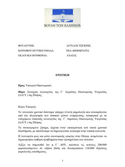 Σύμφωνα με την ερώτηση του Αχαιού βουλευτή κ. Τσιγκρή: "το τελευταίο χρονικό διάστημα υπάρχει έντονη φημολογία που αναπαράγεται από την πλειοψηφία των τοπικών μέσων ενημέρωσης, αναφορικά με το ενδεχόμενο διακοπής λειτουργίας της Γ΄ Δημόσιας Οικονομικής Υπηρεσίας (Δ.Ο.Υ.) της Πάτρας.