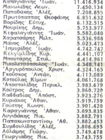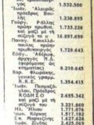 Τρίτος ήταν ο Βαρδής Βαρδινογιάννης με 73.103.834 δραχμές, ενώ πρώτος πολιτικός στη λίστα, ήταν ο βουλευτής τότε, και πρώην πρωθυπουργός, Γεώργιος Ράλλης με 16.897.690 δραχμές.