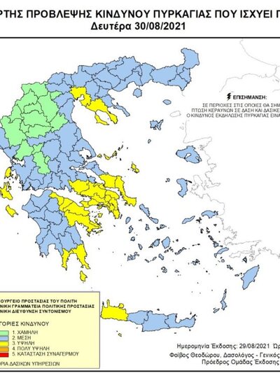 Ο κίνδυνος για φωτιές τη Δευτέρα (30.08.2021) είναι υψηλός (Κατηγορία 3) για τις παρακάτω περιφέρειες και περιοχές.