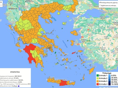 Στο «κόκκινο» (επίπεδο 4) βρίσκονται πλέον επιδημιολογικά οι περιφέρειες Ηρακλείου, Αχαΐας, Ηλείας, Μεσσηνίας, καθώς και ο δήμος Ικαρίας, σύμφωνα με τον επιδημιολογικό χάρτη της κυβέρνησης.
