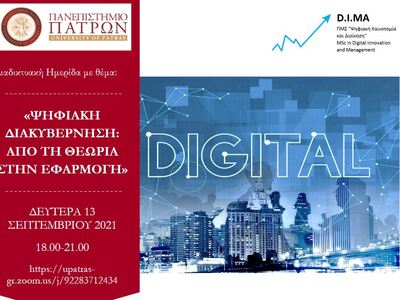 Το Τμημα ΔΕΤ του Πανεπιστημίου Πατρων στα πλαισια της εναρξης του δευτερου κυκλου του μεταπτυχιακου προγραμματος σπουδών στην ΨΗΦΙΑΚΗ ΔΙΑΚΥΒΕΡΝΗΣΗ (dima.upatras.gr) διοργανώνει με στελέχη του Υπουργειου Ψηφιακής Διακυβέρνησης διαδικτυακή ημεριδα με τιτλο"Ψηφιακή Διακυβερνηση: Απο την θεωρία στην εφαρμογη (https://upatras-gr.zoom.us/j/92283712434) [1]
