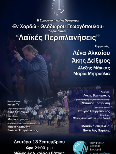 Μία μεγάλη συναυλία με γνωστούς και αγαπητούς καλλιτέχνες θα πραγματοποιήσει τη Δευτέρα 13 Σεπτεμβρίου 2021 στο μόλο της Αγίου Νικολάου στην Πάτρα, η 60μελής Λαϊκή Συμφωνική Ορχήστρα "Εν Χορδώ" Θεόδωρος Γεωργόπουλος.