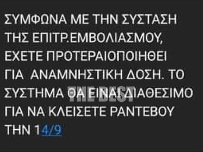 Ξεκίνησε η αποστολή μηνυμάτων για την τρίτη δόση του εμβολίου κατά του κορωνοϊού. Έχουν αρχίσει και αποστέλλονται τα μηνύματα σε 285 χιλιάδες συμπολίτες μας που ανήκουν στις ομάδες που θα πρέπει να εμβολιαστούν με την ενισχυτική δόση.