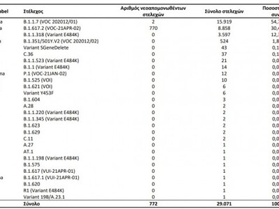 Εκ των 772 δειγμάτων με στελέχη ειδικού ενδιαφέροντος, τα 770 αφορούν στο στέλεχος Delta και 2 αφορούν στο Alpha.