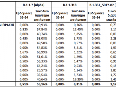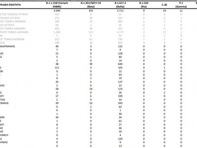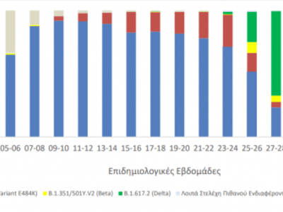 Από τα δείγματα αυτά, 42,66% αφορούν στο B.1.1.318 (Variant E484K), 29,73% στο Delta, 15,50% στο Alpha, 6,55% στο Beta, 0,13% στο C.36 και 0,10% στο Gamma.