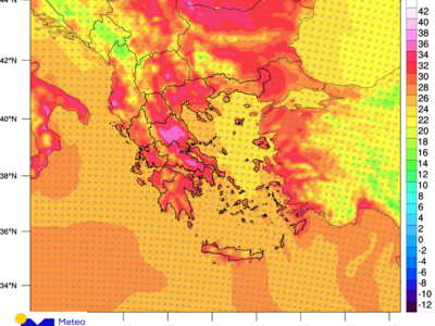 Η θερμοκρασία θα κυμανθεί στη Δυτική Μακεδονία από 14 έως 30 βαθμούς, στην υπόλοιπη Βόρεια Ελλάδα από 12 έως 38, στην Ήπειρο από 12 έως 33 βαθμούς, στη Θεσσαλία από 15 έως 37, στα υπόλοιπα ηπειρωτικά από 15 έως 38, στα νησιά του Ιονίου από 15 έως 33 βαθμούς και στα νησιωτικά τμήματα του Αιγαίου και στην Κρήτη από 13 έως 31-34, ενώ στα νησιά του Ανατολικού Αιγαίου και στα Δωδεκάνησα οι μέγιστες θερνμοκρασίες θα φτάσουν στους 34-35 βαθμούς Κελσίου.
