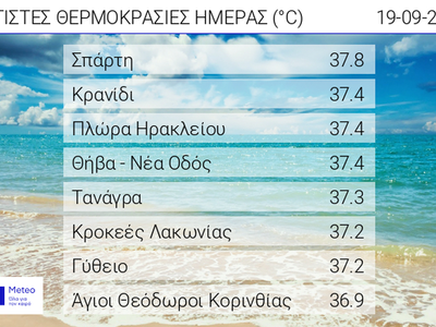 Υψηλές μέγιστες για την εποχή σημειώθηκαν την Κυριακή 19 Σεπτεμβρίου, με τον υδράργυρο να φτάνει κατά τόπους στους 36-38 βαθμούς Κελσίου. Στον πίνακα που ακολουθεί παρουσιάζονται οι 8 υψηλότερες μέγιστες θερμοκρασίες έως τις 17:30, όπως αυτές καταγράφηκαν από το δίκτυο αυτόματων μετεωρολογικών σταθμών του Εθνικού Αστεροσκοπείου Αθηνών