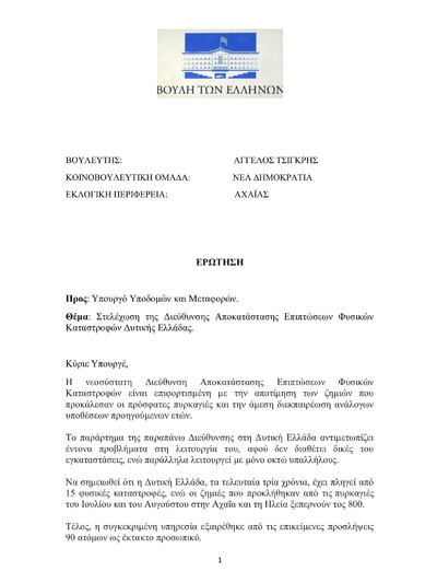 Στο πλαίσιο του κοινοβουλευτικού ελέγχου, ο βουλευτής Αχαΐας της Νέας Δημοκρατίας Άγγελος Τσιγκρής, κατέθεσε Ερώτηση προς τον Υπουργό Υποδομών και Μεταφορών, με την οποία ζητάει τη στελέχωση της Διεύθυνσης Αποκατάστασης Επιπτώσεων Φυσικών Καταστροφών Δυτικής Ελλάδας
