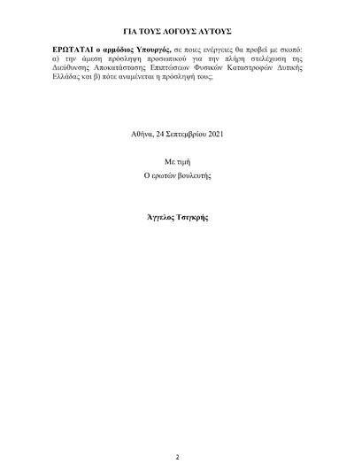 Πιο συγκεκριμένα, ο Αχαιός βουλευτής Άγγελος Τσιγκρής ρωτάει τον Υπουργό Υποδομών και Μεταφορών, σε ποιες ενέργειες θα προβεί με σκοπό: α) την άμεση πρόσληψη προσωπικού για την πλήρη στελέχωση της Διεύθυνσης Αποκατάστασης Επιπτώσεων Φυσικών Καταστροφών Δυτικής Ελλάδας και β) πότε αναμένεται η πρόσληψή τους.