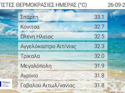 Σύμφωνα με το δίκτυο αυτόματων μετεωρολογικών σταθμών του Εθνικού Αστεροσκοπείου Αθηνών / meteo.gr, οι οκτώ υψηλότερες θερμοκρασίες κατά τις μεσημεριανές ώρες της Κυριακής 26/09, παρουσιάζονται στον παρακάτω Πίνακα.