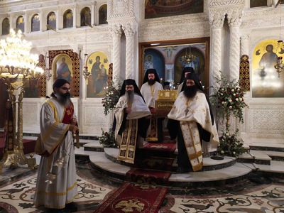 Το Σάββατο το απόγευμα στον εσπερινό τον Θείο λόγο κήρυξε ο Επίσκοπος Ευκαρπίας κ. Ιερόθεος, ο οποίος αναφέρθηκε στον Άγιο Ανδρέα αλλά και στη περιπετειώδη διαδρομή των ιερών λειψάνων του.