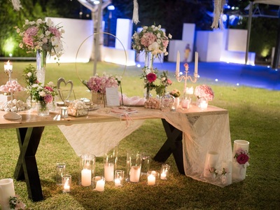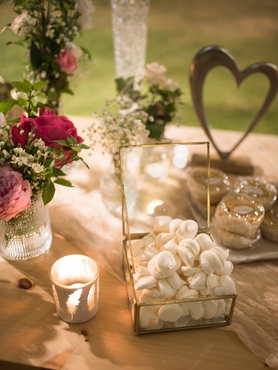 Στον Ιερό Ναό Αγίου Νικολάου Κ. Σιχαινών η νύφη έφθασε συνοδευμένη από τον πατέρα της, γνωστό συμπολίτη Σταύρο Μαλλιώρη και την υπόλοιπη οικογένεια. Ο γάμος έγινε σε κλειστό κύκλο λόγω των συνθηκών της πανδημίας, οπότε στο μυστήριο αλλά και στο γλέντι με τις κρητικές επιρροές που ακολούθησε στο Privilege Event House, παρέστησαν μόνο στενοί συγγενείς και φίλοι αλλά και λίγοι καλεσμένοι από τον επιχειρηματικό κόσμο της Κρήτης και μεμονωμένες εκπρόσωποι της «Καλλιπάτειρας». Όπως θα δείτε στο wedding deco style κυριάρχησαν οι παιόνιες, οι ορτανσίες και οι ορχιδέες σε συνδυασμό με ευωδιαστό βασιλικό. Όλα τα υπόλοιπα στοιχεία είχαν μια τρυφερή, κοριτσίστικη αύρα. Οι μπομπονιέρες από ροζ δαντέλα με το ασημένιο σήμα της «αγάπης στο άπειρο» που επιμελήθηκε το κοσμηματοπωλείο Μέντης ήταν ασορτί με τα στέφανα. Πολλά τα κεριά, οι ανθοσυνθέσεις, τα κηροπήγια με «ζαχαρένια» αισθητική.