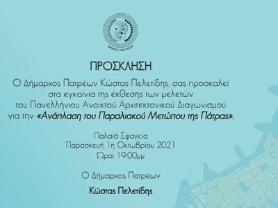 Από τον Δήμαρχο Πατρέων, Κώστα Πελετίδη, εγκαινιάζεται την Παρασκευή, 1η Οκτωβρίου, στις 7 μ.μ. στο χώρο των Παλαιών Σφαγείων, η έκθεση των μελετών του Πανελλήνιου Ανοικτού Αρχιτεκτονικού Διαγωνισμού για την «Ανάπλαση του Παραλιακού Μετώπου της Πάτρας».