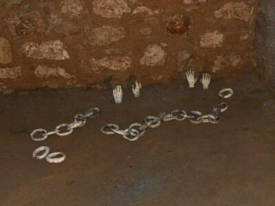Στον θάλαμο ακριβώς απέναντι (αριστερά) έχουν τοποθετηθεί οι «Αλυσίδες» του Σπύρου Μεθενίτη, από λευκό πηλό χαμηλής θερμοκρασίας με προσθήκη οξειδίων. Το έργο προσεγγίζει σύμφωνα με την επιμελήτρια της έκθεσης, τη δίψα του ατόμου για ελευθερία, όπως φανερώνουν τα υψωμένα χέρια σε μια χειρονομία δραματικής έκκλησης, τη στιγμή που μόλις έχουν σπάσει τις αλυσίδες που τα κρατούσαν δέσμια.
