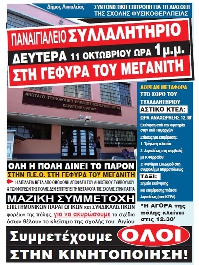 Από τη Συντονιστική Επιτροπή του δήμου και των φορέων της Αιγιάλειας ανακοινώνεται η διεξαγωγή Παναιγιάλειου Συλλαλητηρίου την ερχόμενη Δευτέρα 11 Οκτωβρίου και ώρα 1.00μ.μ. στη Γέφυρα του Μεγανίτη (επί της Παλαιάς Εθνικής Οδού) κατά των ενεργειών για τη μεταφορά της σχολής Φυσικοθεραπείας Αιγίου στην Πάτρα.