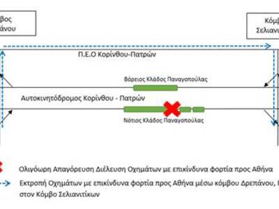 Στο διάστημα αυτό η κυκλοφορία των συγκεκριμένων οχημάτων θα διεξάγεται μέσω της Παλαιάς Εθνικής Οδού και συγκεκριμένα μέσω κατάλληλης προσωρινής σήμανσης τα οχήματα μεταφοράς επικίνδυνων φορτίων θα εκτρέπονται στον Κόμβο Δρεπάνου (Χ.Θ. 197,1) προς την Π.Ε.Ο. και θα επανεισέρχονται στον αυτοκινητόδρομο μέσω του Κόμβου Σελιανιτίκων (Χ.Θ. 180,5), όπως φαίνεται στο ακόλουθο σχηματικό διάγραμμα.