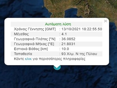 Σύμφωνα με το Γεωδυναμικό Ινστιτούτο, το επίκεντρο του σεισμού εντοπίζεται 93 χλμ νότια της Πύλου, ενώ το εστιακό βάθος ήταν 10χλμ.