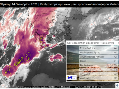 Τα στοιχεία του δικτύου των αυτόματων μετεωρολογικών σταθμών του Εθνικού Αστεροσκοπείου Αθηνών/meteo.gr κατέγραψαν τα μεγαλύτερα ύψη βροχής από την αρχή του εικοσιτετραώρου έως σήμερα το πρωί, Πέμπτη 14 Οκτωβρίου, στα Στύρα Ευβοίας (44 χιλιοστά), στα Θεοδώριανα Άρτας (44), στο Αγγελόκαστρο Αιτωλοακαρνανίας (42) και στην Ιθάκη (41).