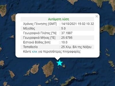 Ισχυρός σεισμός μεγέθους 5 βαθμών της κλίμακας Ρίχτερ έγινε στις 18.02 στα ανοιχτά της Νάξου.