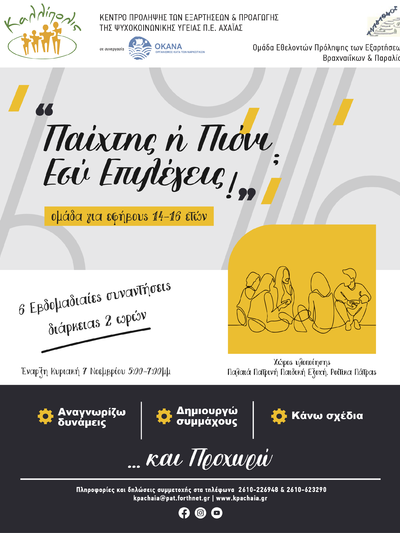 Μια ομάδα για εφήβους 14 έως 16 ετών με σύνθημα «Παίχτης ή Πιόνι; Εσύ Επιλέγεις!» ξεκινάει στα Ροΐτικα Πατρών, από το Κέντρο Πρόληψης Αχαΐας «Καλλίπολις» (Ν. Ε. Ο. Πατρών - Αθηνών 35, Πάτρα, τηλ/Fax: 2610 226948 - 2610 623290) και την εθελοντική ομάδα «Αναβαθμός» Βραχναιΐκων – Παραλίας.