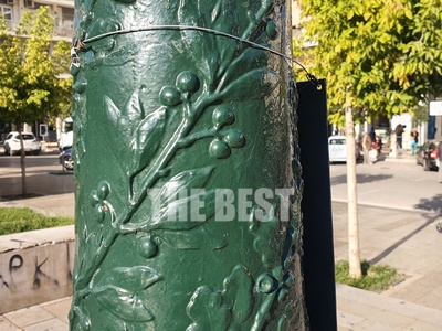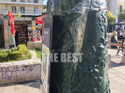 Εντοπίσαμε πλαστική πινακίδα με το απαραίτητο QR CODE η οποία εξακολουθεί να βρίσκεται κολλημένη με σελοτέιπ και σύρμα πάνω σε κολώνα του δήμου Πατρέων στο κάτω μέρος της πλατείας Γεωργίου.