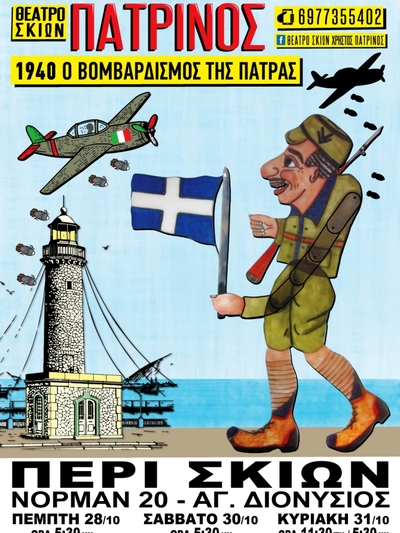Την επετειακή παράσταση με τίτλο «1940 ο βομβαρδισμός της Πάτρας» θα παρουσιάσει στο κοινό ο γνωστός καραγκιοζοπαίχτης Χρήστος Πατρινός στο «Περί Σκιών στο πλαίσιο του φετινού εορτασμού της 28ης Οκτωβρίου.