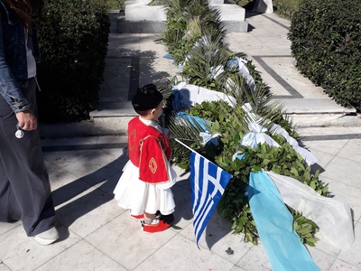 Είναι ένα μικρός γλυκός τσολιάς μπροστά από τη Μνημείο της Δόξας στην πλατεία Εθνικής Αντίστασης στην Πάτρα. Το τσολιαδάκι της φωτογραφίας είναι ο γιος του Βασίλη Καράπαπα, Αντιπροέδρου των Εθελοντών Πυροσβεστών Αχαΐας και της Ασπασίας Αθανασοπούλου. Ο Παναγιώτης είναι μόλις ενάμιση ετών και εγγονός του αείμνηστου λαϊκού τραγουδιστή Πάνου Καράπαπα που έφυγε πριν δύο περίπου χρόνια από τη ζωή.