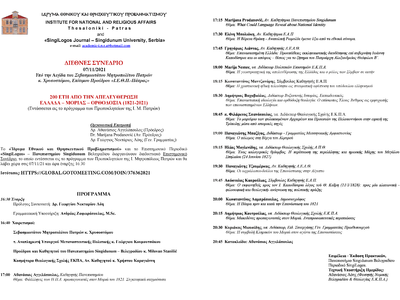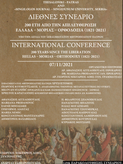 Αυτή την Κυριακή 7 Νοεμβρίου 2021 πρόκειται να πραγματοποιηθεί διαδικτυακό Διεθνές Συνέδριο με θέμα: «200 έτη από την απελευθέρωση: Ελλάδα-Μοριάς-Ορθοδοξία (1821-2021)» υπό την αιγίδα της Ιεράς Μητροπόλεως Πατρών σε συνδιοργάνωση με το Ίδρυμα Εθνικου και θρησκευτικού προβληματισμού καθώς και το επιστημονικό περιοδικό Singilogos τοῦ Πανεπιστημίου Singidunum του Βελιγραδίου.